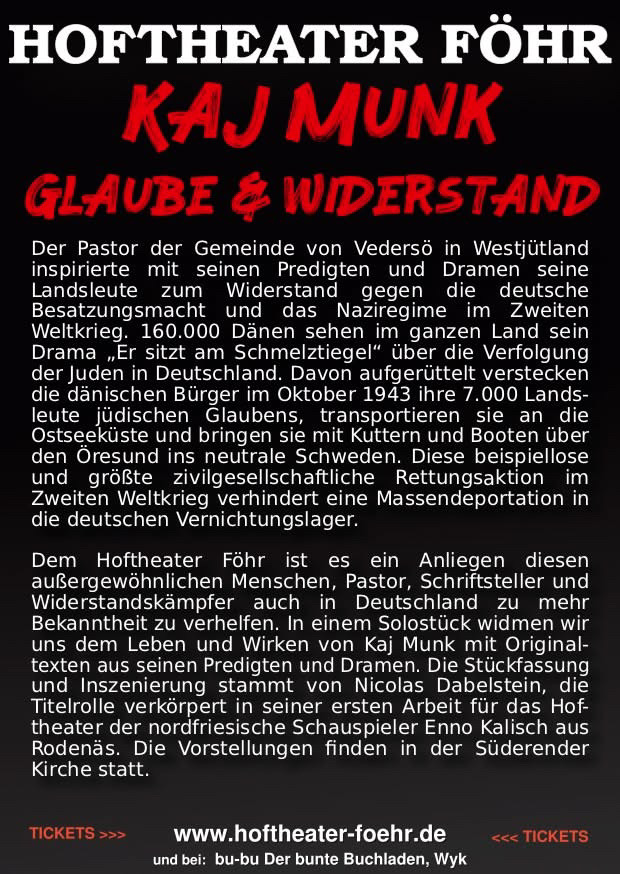 31.03.2026, 21:00 Uhr, Süderender Kirche St. Laurentii, Föhr: „Kai Munk – Glaube und Widerstand“